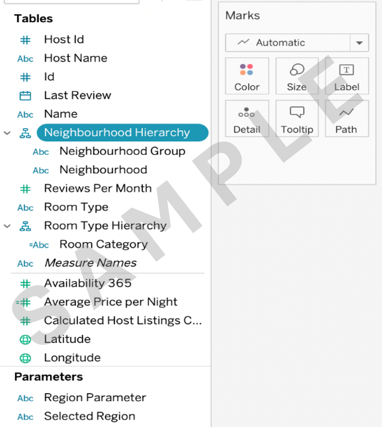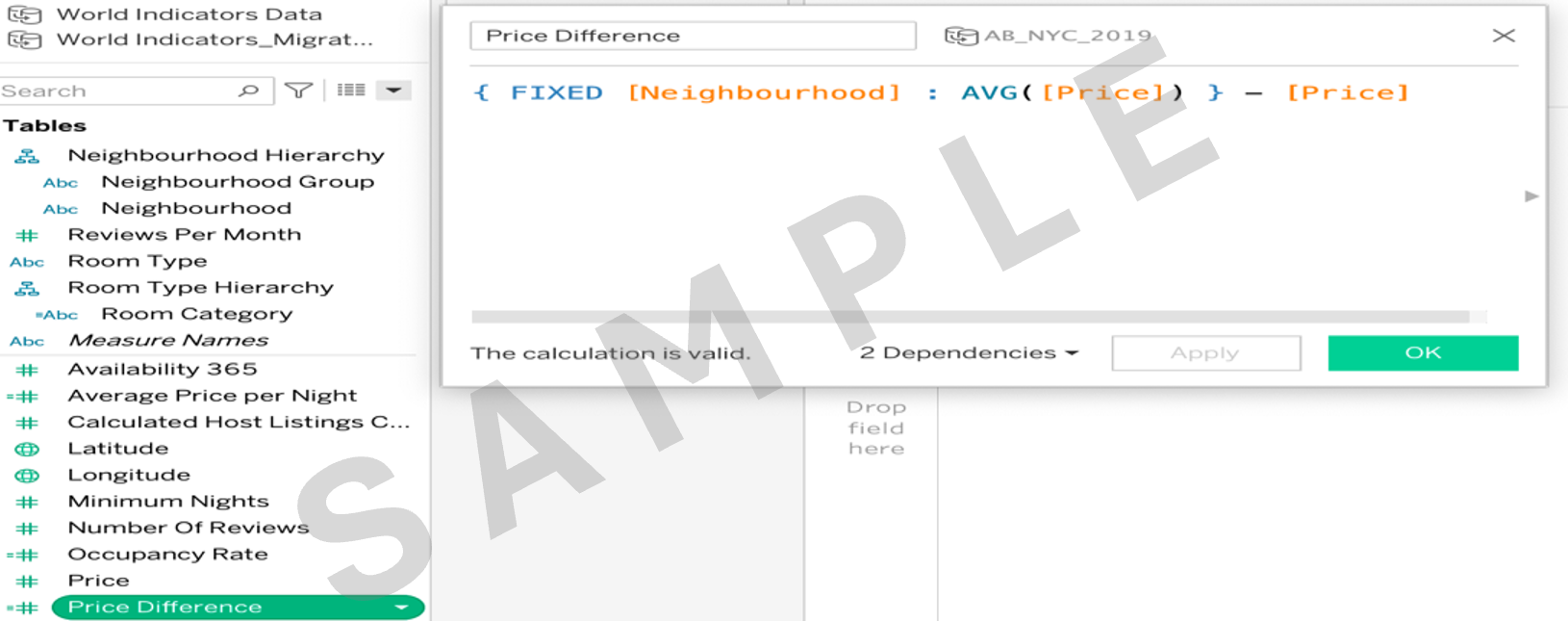 4.1 Create a calculated field named Price Difference using LOD calculations to show the difference between a listing's Price and the average price in its neighborhood.