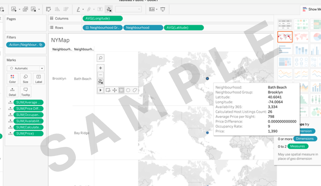 5.1 Enhance your map visualizations by adding tooltips that display additional information on hover, such as Calculated Host Listings Count, Price Difference, Total Revenue, and Occupancy Rate.