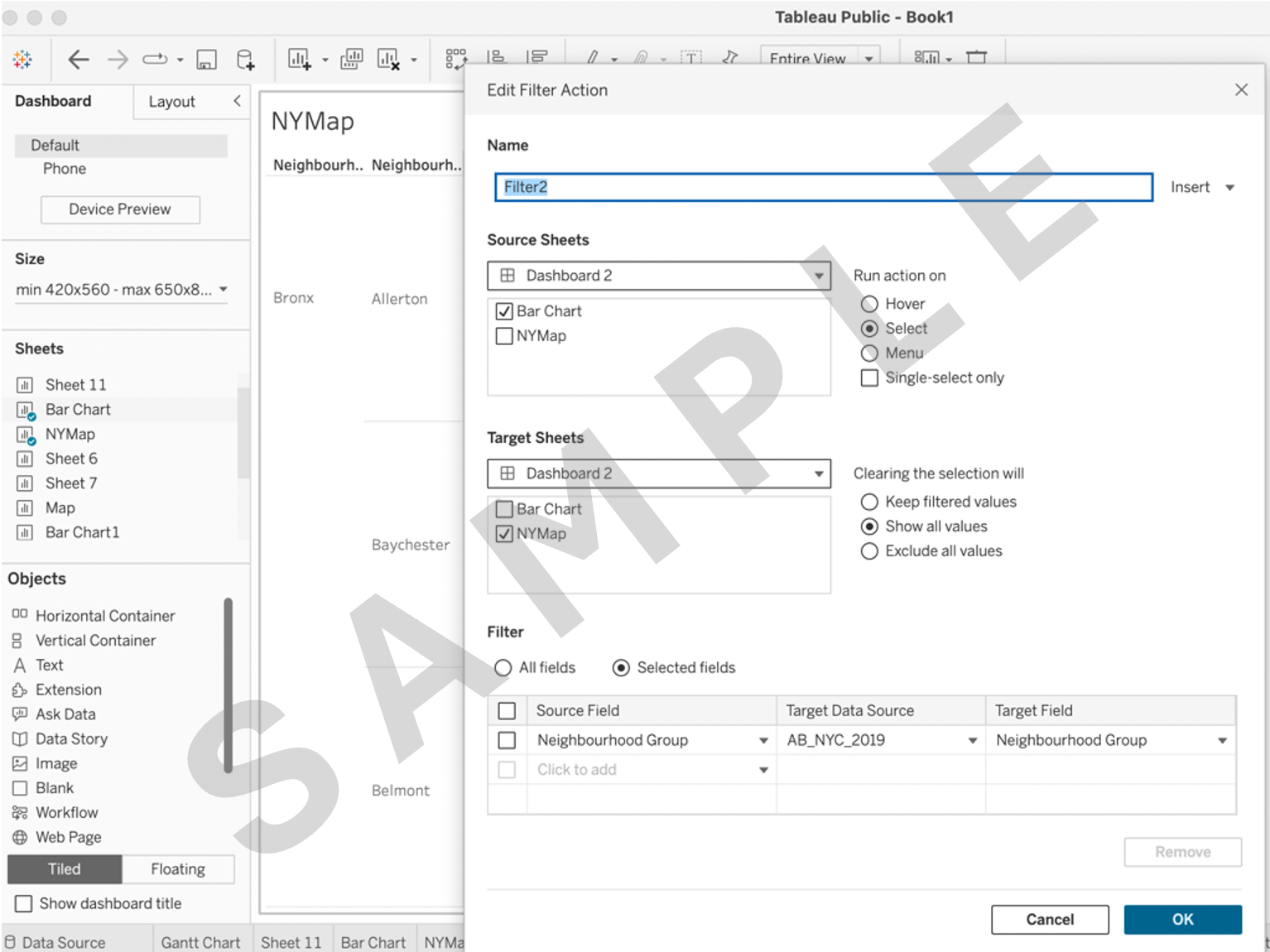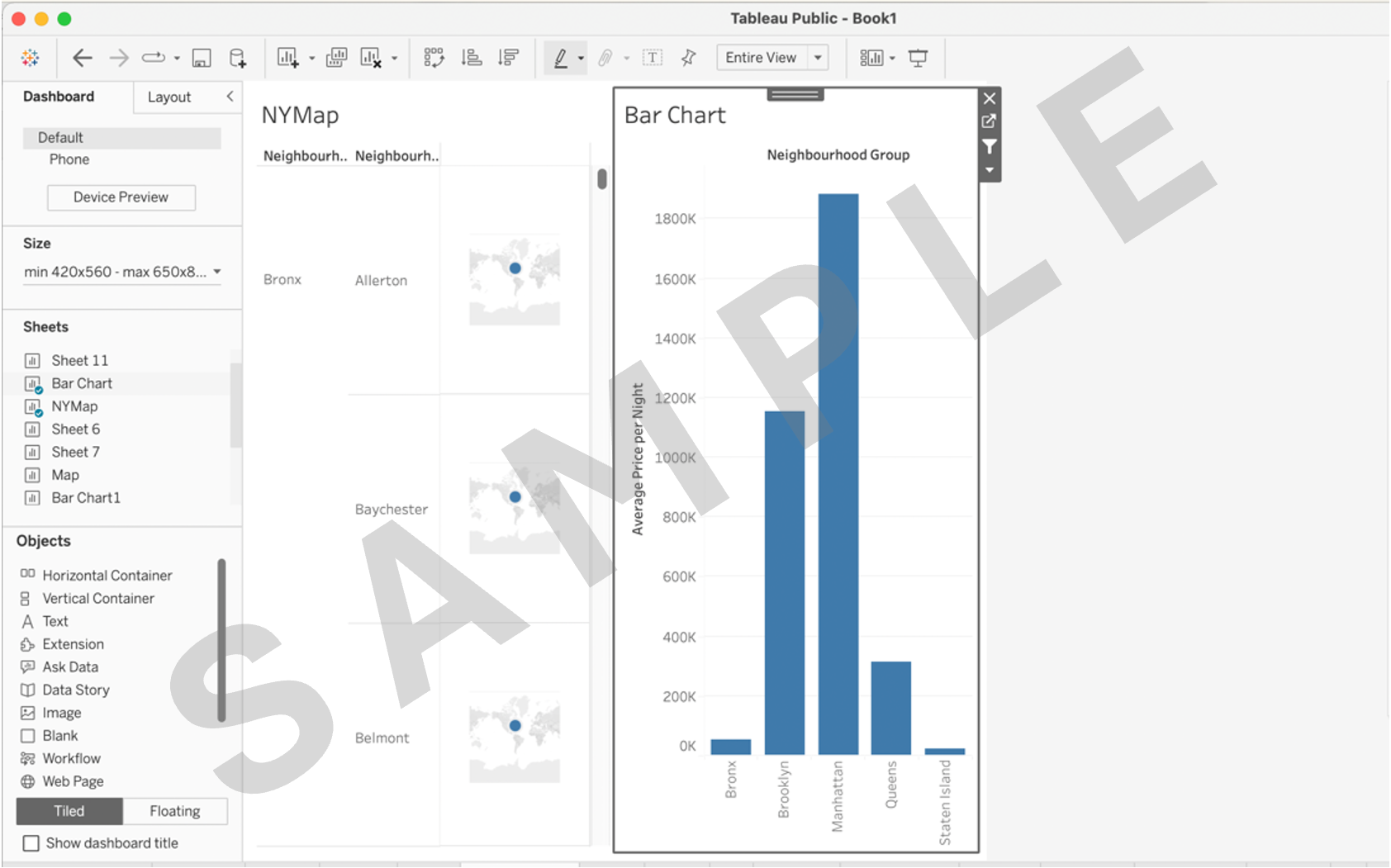 7.1 Create a filter action that allows users to select a specific Neighbourhood Group on the bar chart and see the corresponding price distribution and other details in each neighborhood in the map.
