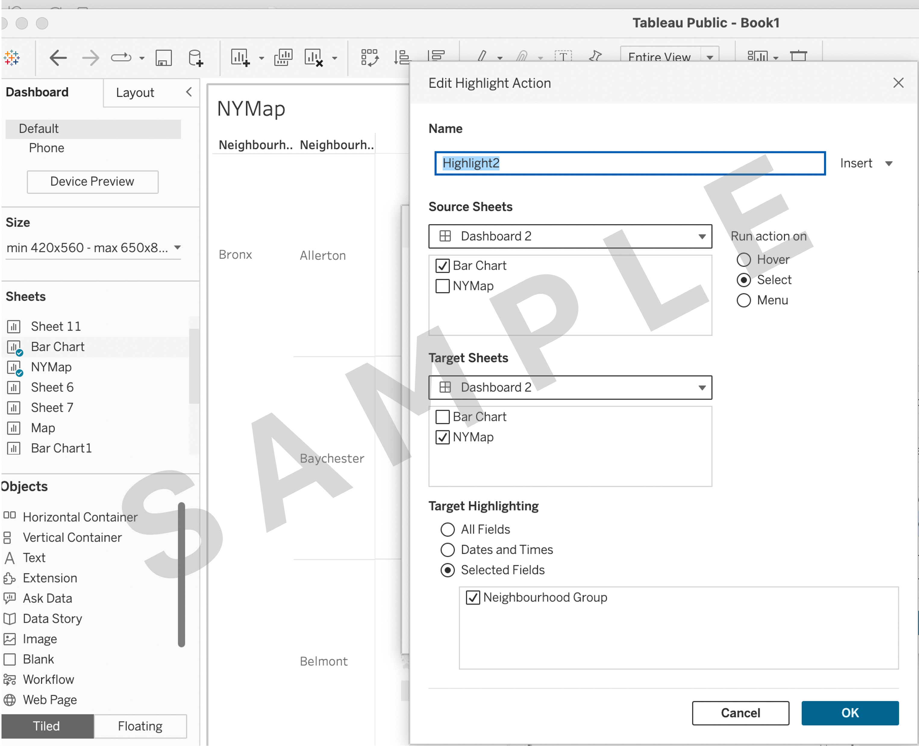 7.2 Implement a highlight action that emphasizes listings of a specific Neighbourhood Group when selected on the bar chart.